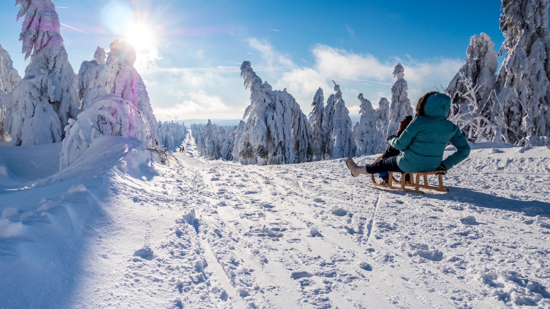 Erzgebirge: Mother and child ride sledges in the snowy mountains