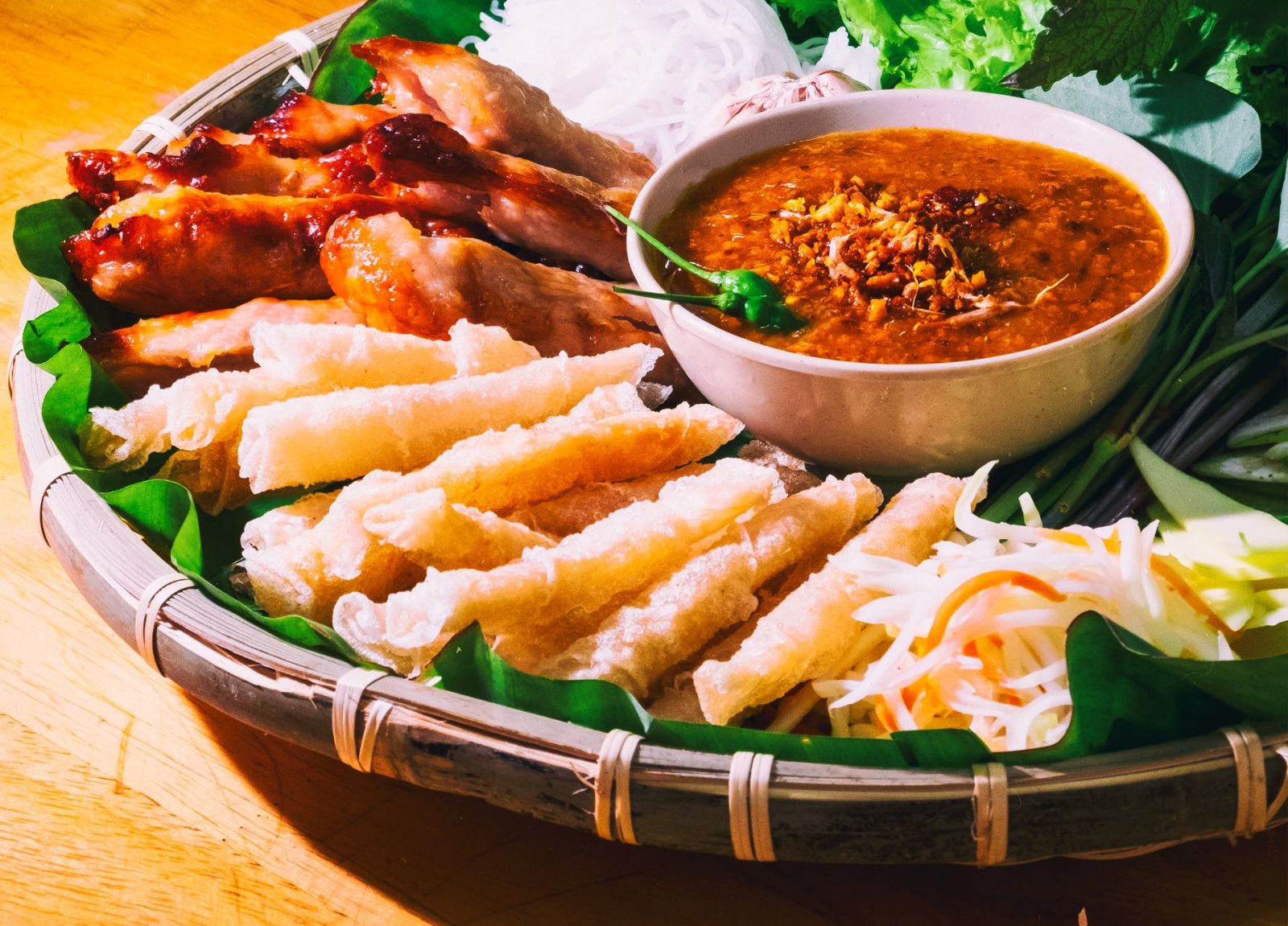 ‘Nem nướng’, loosely translates into ‘Vietnamese grilled pork sausage’ or ‘grilled meatball’, and is a popular Vietnamese food item that can be served as an individual appetizer or snack, or served with rice noodles or rice as a main course. A specialty of Khánh Hòa Province, ‘Nem nướng’ is made from grilled pork meatballs or sausages marinated with fatty minced pork and seasoned with shallots, garlic, fish sauce, sugar, and black pepper. Once prepared, it is then skewered and grilled over charcoal according this dish its savoury, smokey and delicious reputation. To eat, you simply wrap the ‘Nem nướng’ in rice paper, layer on some lettuce, vermicelli rice noodles or sticky rice, pickled carrots (plus any other condiments on the table) and dip it into a peanut sauce to finish.