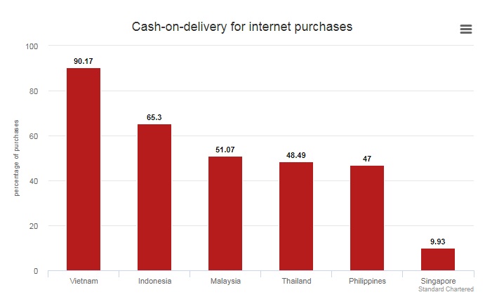 Even though the country’s e-commerce industry has been growing at double-digit rate in recent years, 90.2 percent of online purchases are paid with cash, the report said. This ratio is highest, compared to only 47 percent in the Philippines where the percentage of population with bank accounts is only slightly higher than that of Vietnam.