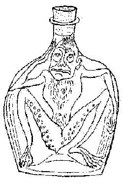 Le fils, cependant, partit par la forêt, mangea son pain et, tout joyeux, il regardait à travers les branches pour voir s’il ne découvrirait pas un nid. Il alla ainsi, de-ci, de-là, jusqu’à ce qu’il arrivât à un grand chêne, vieux de plusieurs centaines d’années, et que cinq hommes se tenant par les bras n’auraient certainement pas pu enlacer. Il s’arrêta, regarda le géant et songea: « Il y a certainement plus d’un oiseau qui y a fait son nid. » Tout à coup, il lui sembla entendre une voix. Il écouta et comprit: « Fais-moi sortir de là! Fais-moi sortir de là! » Il regarda autour de lui, mais ne vit rien. Il lui parut que la voix sortait de terre. Il s’écria: « Où es-tu? » La voix répondit: « Je suis là, en bas, près des racines du chêne. Fais-moi sortir! Fais-moi sortir! » L’écolier commença par nettoyer le sol, au pied du chêne, et à chercher du côté des racines. Brusquement, il aperçut une bouteille de verre enfoncée dans une petite excavation. Il la saisit et la tint à la lumière. Il y vit alors une chose qui ressemblait à une grenouille; elle sautait dans la bouteille. « Fais-moi sortir! Fais-moi sortir! » ne cessait-elle de crier. Sans songer à mal, l’écolier enleva le bouchon. Aussitôt, un esprit sortit de la bouteille, et commença à grandir, à grandir tant et si vite qu’en un instant un personnage horrible, grand comme la moitié de l’arbre se dressa devant le garçon. « Sais-tu quel sera ton salaire pour m’avoir libéré? » lui demanda-t-il d’une épouvantable voix. « Non, » répondit l’écolier qui ne ressentait aucune crainte. « Comment le saurais-je? » – « Je vais te tuer! » hurla l’esprit. « Je vais te casser la tête! » – « Tu aurais dû me le dire plus tôt, » dit le garçon. « Je t’aurais laissé où tu étais. Mais tu ne me casseras pas la tête. Tu n’es pas seul à décider! » – « Pas seul à décider! Pas seul à décider! » cria l’esprit. « Tu crois ça! T’imaginerais-tu que c’est pour ma bonté qu’on m’a tenu enfermé si longtemps? Non! c’est pour me punir! je suis le puissant Mercure. Je dois rompre le col à qui me laisse échapper. » – « Parbleu! » répondit l’écolier. « Pas si vite! Il faudrait d’abord que je sache si c’était bien toi qui étais dans la petite bouteille et si tu es le véritable esprit. Si tu peux y entrer à nouveau, je te croirai. Après, tu feras ce que tu veux. » Plein de vanité, l’esprit déclara: « C’est la moindre des chose. » Il se retira en lui-même et se fit aussi mince et petit qu’il l’était au début. De sorte qu’il put passer par l’étroit orifice de la bouteille et s’y faufiler à nouveau. À peine y fut-il entré que l’écolier remettait le bouchon et lançait la bouteille sous les racines du chêne, là où il l’avait trouvée. L’esprit avait été pris.