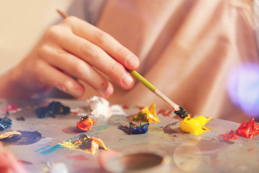 Relaxation and fun. Scaled up view on a kid painting something and mixing bright multi colored paints on a palette while working on a new masterpiece.