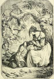 Now when it was noon the King said, “One of you girls must take him something to eat.” – “No,” said the two eldest, “We will not take it to him; the one by whom he last watched, can take him something.” Then the youngest was forced to go and take him something to eat. When she got into the forest, she asked him how he was getting on? “Oh,” said he, “I am getting on very badly.” Then she said he was to come and just eat a little. “Nay,” said he, “I cannot do that, I shall still have to die, so I will eat no more.” Then she spoke so kindly to him and begged him just to try, that he came and ate something. When he had eaten something she said, “I will comb thy hair a while, and then thou wilt feel happier.”