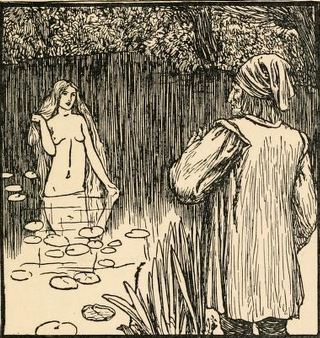 Then the Queen asked why he had not brought their daughter with him, and he said, “Nay, I ran a long time after her, and just as I thought I should soon overtake her, a church was standing there and a priest was in the pulpit preaching.” – “Thou shouldst just have brought the priest,” said his wife, “and then the church would soon have come. It is no use to send thee, I must go there myself.” When she had walked for some time, and could see the two in the distance, the King’s daughter peeped round and saw her mother coming, and said, “Now we are undone, for my mother is coming herself: I will immediately change thee into a fish-pond and myself into a fish.