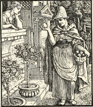 When it had struck six, they went home together. Then said the King, “Is the castle ready?” – “Yes,” said the King’s son. When they sat down to table, the King said, “I cannot give away my youngest daughter until the two eldest are married.” Then the King’s son and the King’s daughter were quite troubled, and the King’s son had no idea what to do. But he went by night to the King’s daughter and ran away with her. When they had got a little distance away, the King’s daughter peeped round and saw her father behind her. “Oh,” said she, “what are we to do? My father is behind us, and will take us back with him. I will at once change thee into a briar, and myself into a rose, and I will shelter myself in the midst of the bush.” When the father reached the place, there stood a briar with one rose on it, then he was about to gather the rose, when the thorn came and pricked his finger so that he was forced to go home again. His wife asked why he had not brought their daughter back with him? So he said he had nearly got up to her, but that all at once he had lost sight of her, and a briar with one rose was growing on the spot.