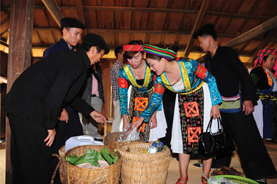 Chú rể và phù rể sẽ phải vái lạy tổ tiên, bố mẹ và anh em trong gia đình cô gái và như thế chàng trai đã được coi cô gái là vợ của mình. Sau khi nhận xong lễ vật, nhà gái sẽ làm các thủ tục cúng tổ tiên, nhà trai nộp lễ và xin đón dâu. Lúc này, hai gia đình sẽ cùng ngồi vào mâm uống rượu, chúc mừng cô dâu, chú rể và nhà trai sẽ xin đón con dâu về nhà.