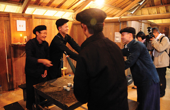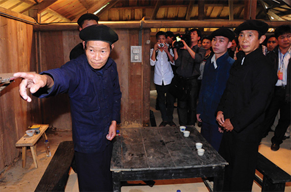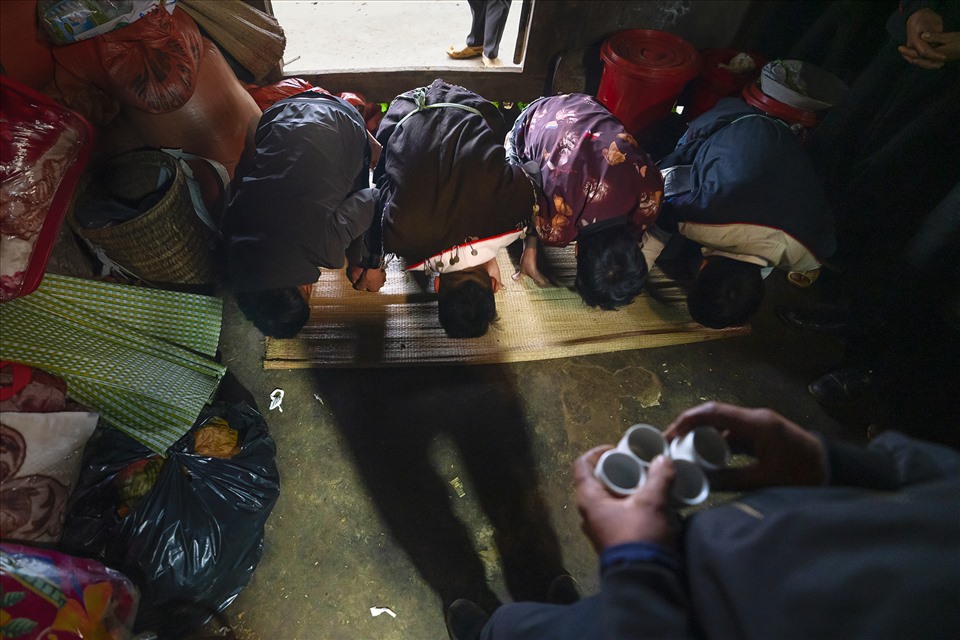 Trong nhà, ông Mối và đại diện nhà trai cùng nhau uống rượu đi vòng tròn quanh bàn hai lần, để xin phép tổ tiên.