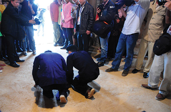 Theo nghi lễ truyền thống, chú rể và phù rể vái lạy tổ tiên và trời đất…