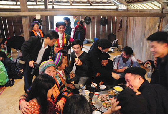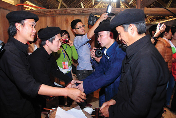 Hai gia đình cùng ngồi vào mâm uống rượu và nhà trai chuẩn bị làm lễ xin dâu.
