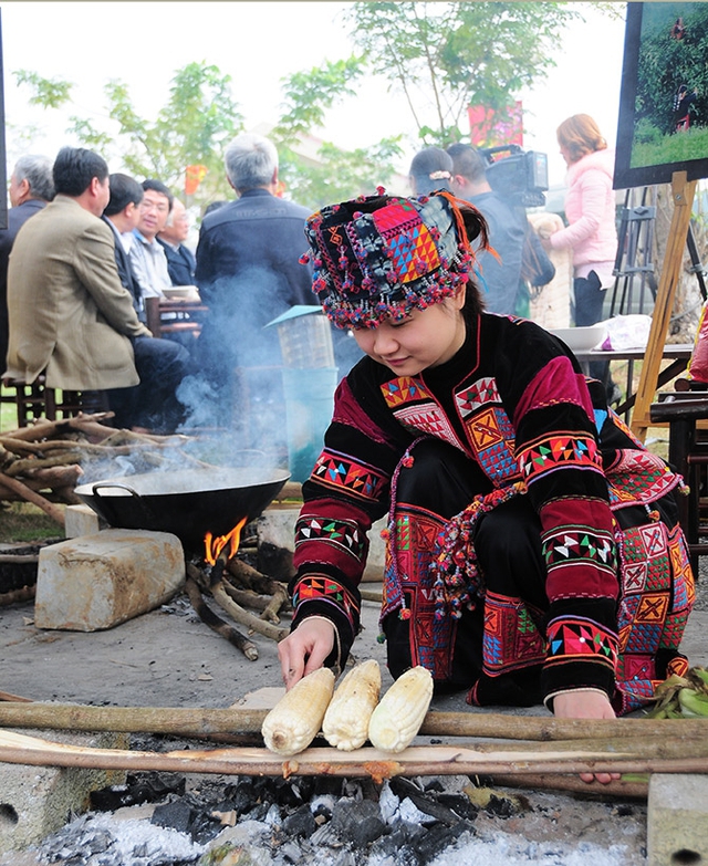 Thiếu nữ dân tộc Lô Lô giới thiệu ẩm thực trong ngày hội văn hóa truyền thống Tây Bắc, tại Làng Văn hóa Du lịch các dân tộc Việt Nam, Đồng Mô (Sơn Tây – Hà Nội)